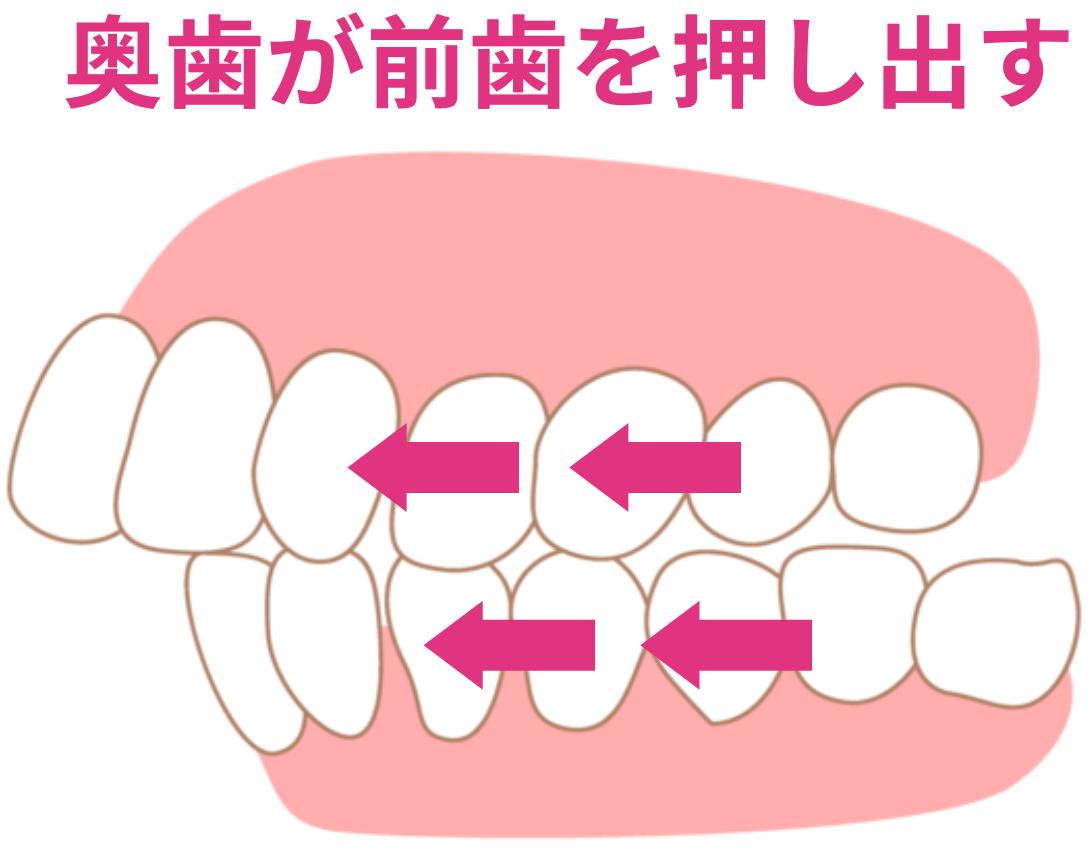 無理矢理、狭いスペースに歯を並べるため、前歯が前方に押し出されて出っ歯になってしまうのです。