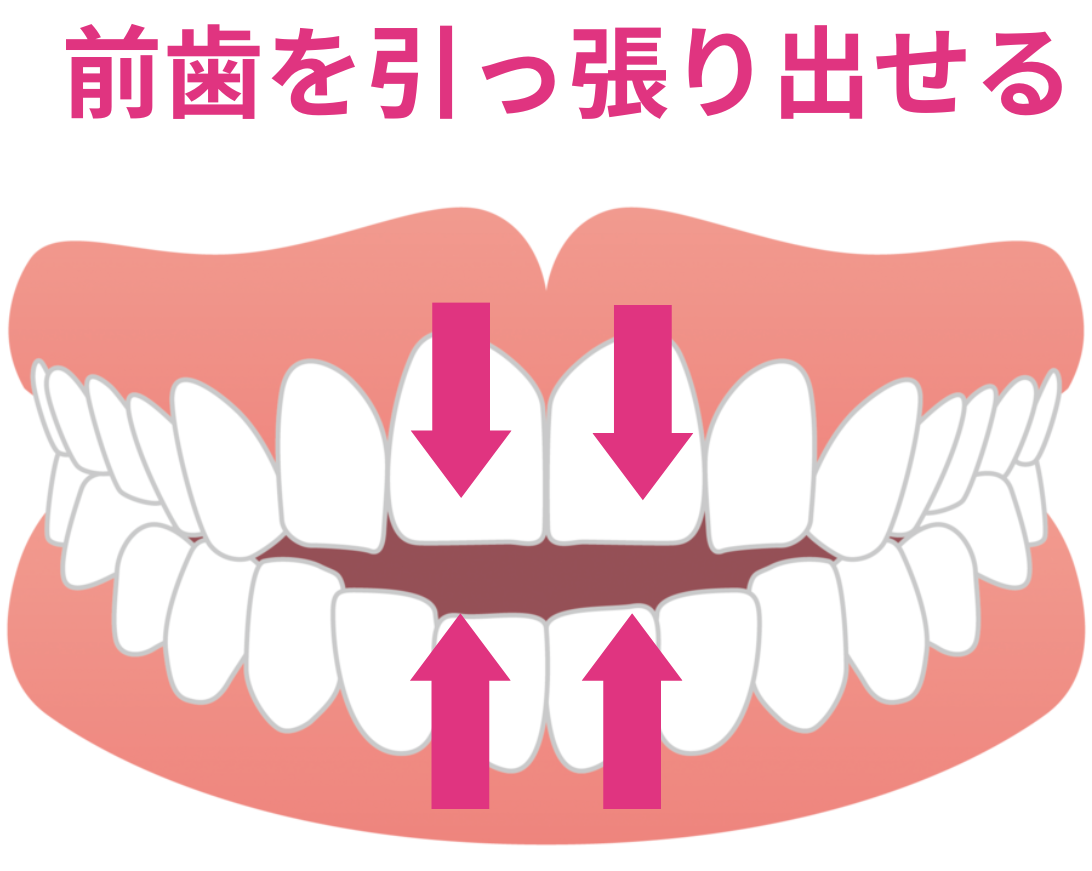 まず、インビザライン以外のマウスピース矯正の多くは、この「前歯を引っ張り出す」挺出が行えません。