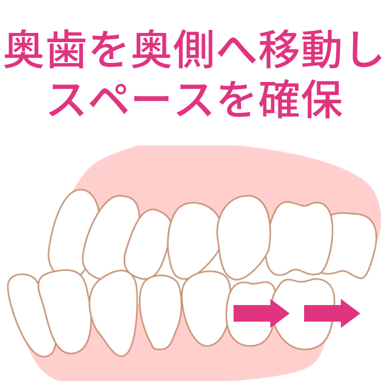このように、奥歯を奥側に動かすことと、必要な抜歯を行うことで、前方に突き出た前歯を下げるスペースを確保するのです。